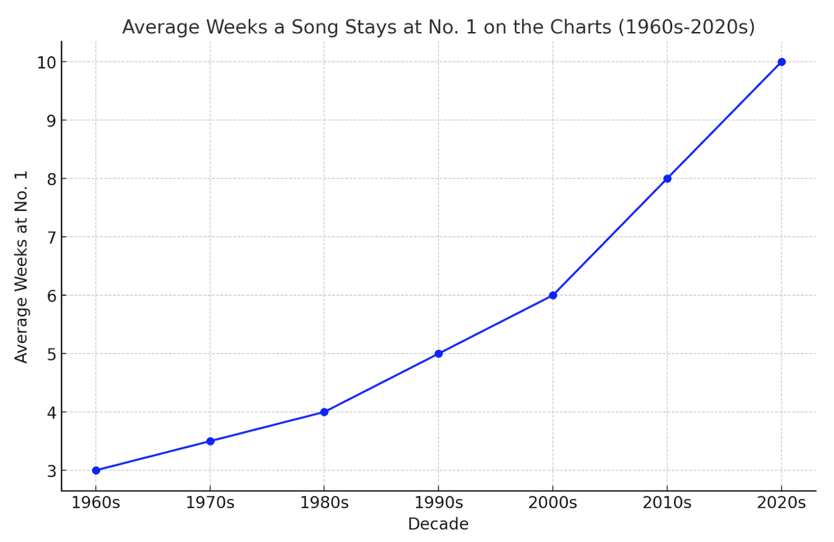 Back in the 1960s, music had a massive distribution issue in that it was relatively difficult to consume. Therefore, the majority of music’s consumption was done by people who had the time, the money, and the passion required to consume it (teens / young adults). And the relatively high cost / difficulty of getting new music meant that, when they found a song, they would have listened to it again and again and again. Compare this to now - in the year of our lord 2024 - when people who don’t even like music are able to put something on in the background at close to zero cost.